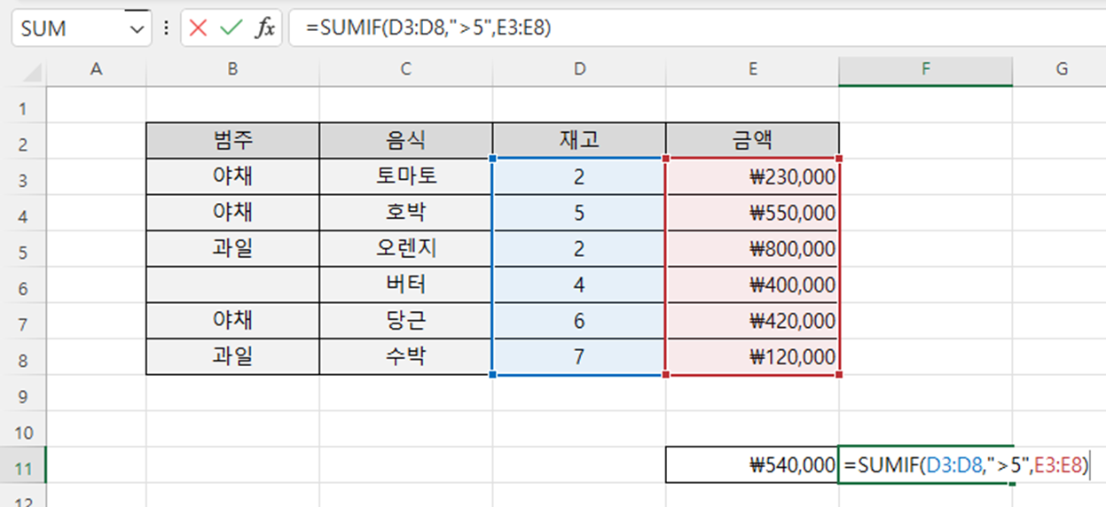 조건식을 적용하여, 조건에 해당하는 항목의 합계를 구하는 함수