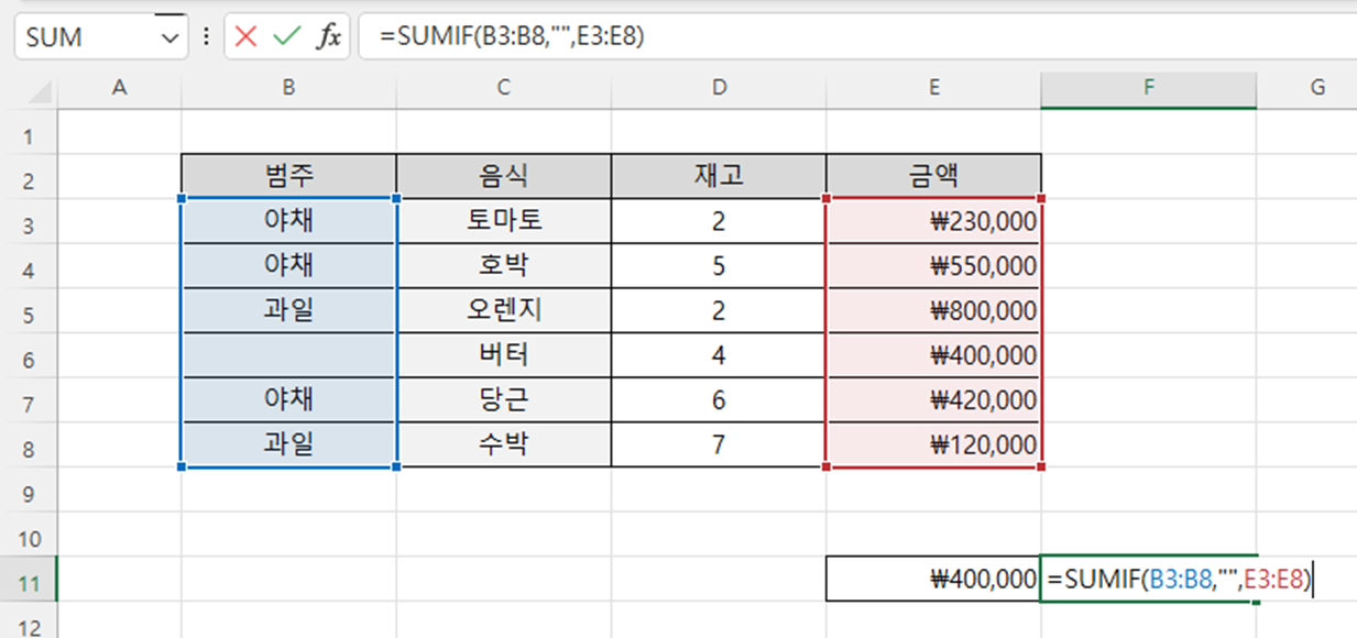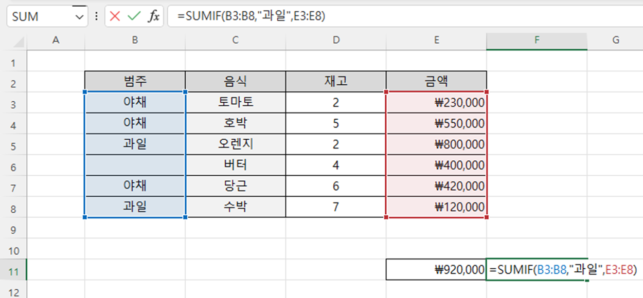 ♣ "범주"에서 "과일"에 해당하는 데이터의 금액 합계