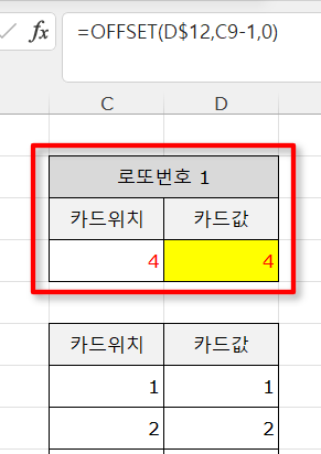 ○ 4번째 위치한 카드에 적힌 카드의 값은 OFFSET() 함수를 이용하여 계산하였으며, "4"이다.