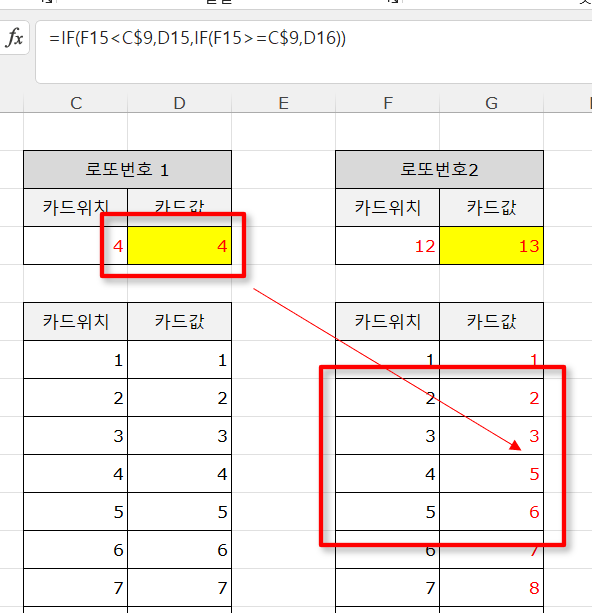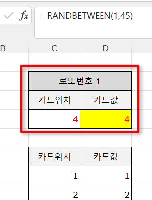 ○ RANDBETWEEN(1, 45)를 이용하여, 첫번째로 "4"번째 카드가 뽑혔다.