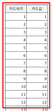 ○ 왼쪽에 숫자가 적힌 카드의 순서를 적고, 오른쪽에는 그 카드에 1~45까지의 숫자를 부여한다.