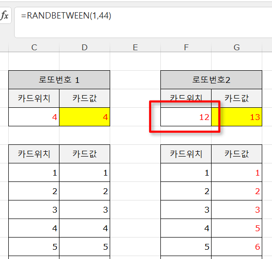 ○ 최종적으로 첫번째 추출됐던 숫자 "4"가 제거된 상태의 카드 더미에서, RANDBETWEEN(1, 44) 함수를 사용하여 두번째 번호를 생성하였다.